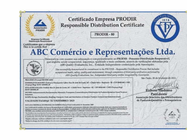A ABC Comércio e Representações Ltda foi certificada com o Prodir – Processo de Distribuição Responsável outorgado pela Associação Brasileira de Distribuidores de Produtos Químicos e Petroquímicos – Associquim.  Essa certificação foi expedida pela ABS Quality Evaluations, Inc. e engloba critérios verificados como saúde ocupacional, segurança, qualidade e meio ambiente, tendo a ABC cumprido os requisitos com "sucesso, adequação e comprometimento ao Prodir".