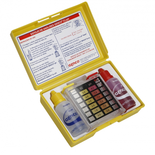O kit é composto por um tubo de medição duplo com escalas, e reagentes para análise do pH e análise do cloro livre.