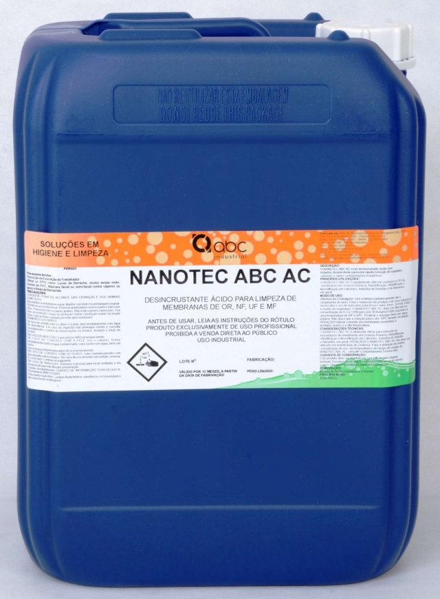 O NANOTEC ABC AC é um desincrustante ácido sem espuma, desenvolvido para uma rápida remoção de sujidades calcárias e outras contaminações inorgânicas durante a limpeza CIP de membranas em Osmose Reversa, Nanofiltração, Ultrafiltração e Microfiltração em Laticínios, Indústria de Bebidas e Alimentos.